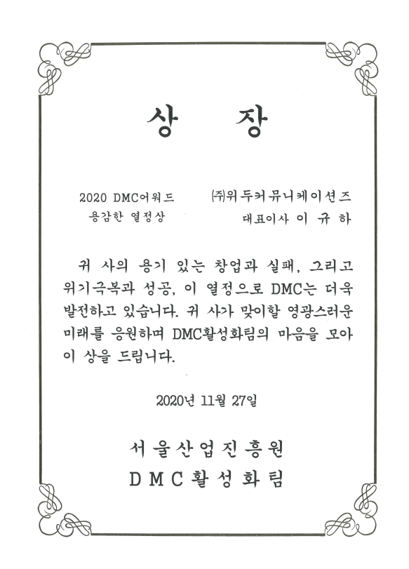 2020 서울산업진흥원 2020 DMC어워드 페이지 정보 작성자 WeDu 댓글 0건 조회 6,247회 작성일 21-12-31 12:57 본문 2020-11-27 2020 DMC어워드 용감한 열정상 서울산업진흥원 DMC활성화팀 List Previous2020 기술혁신 우수기업 21.12.31 Next2018 소년한국 우수 어린이 도서 19.05.30