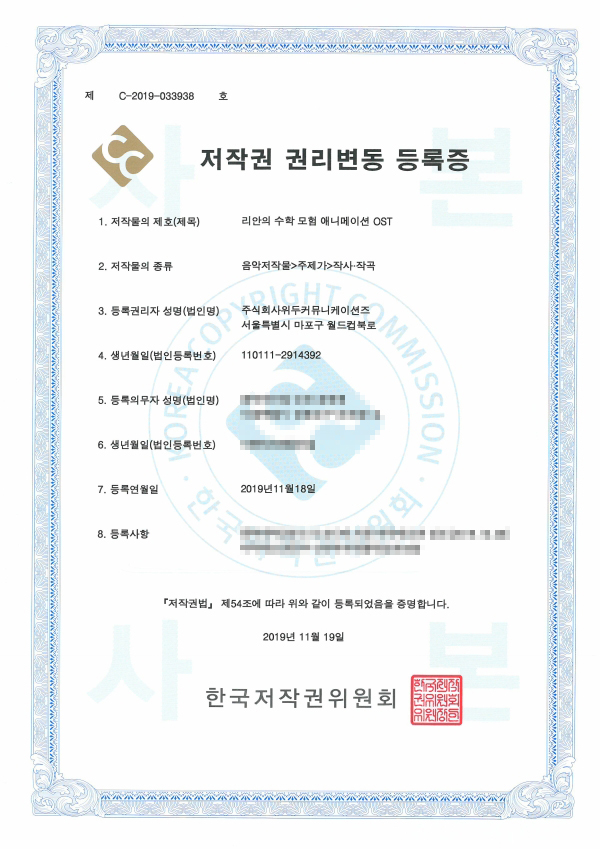 [한국/저작권] 리안의 수학 모험 애니메이션 OST 페이지 정보 작성자 WeDu 댓글 0건 조회 7,057회 작성일 19-11-25 13:54 본문 2019-11-18 저작권 C-2019-033938 음악저작물>주제가>작사·작곡 List Previous[한국/저작권] 리안의 수학 모험 여정의 시작 1,2,3,4,5 21.12.31 Next[한국/저작권] 애니메이션 리안의 수학 모험 19.11.25