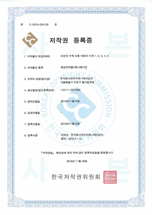 [한국/저작권] 리안의 수학 모험 여정의 시작 1,2,3,4,5 페이지 정보 작성자 WeDu 댓글 0건 조회 6,432회 작성일 21-12-31 12:36 본문 2019-11-20 저작권 C-2019-034130 영상저작물>애니메이션 List Previous[한국/저작권] OLL KIDS/MATH 21.12.31 Next[한국/저작권] 리안의 수학 모험 애니메이션 OST 19.11.25