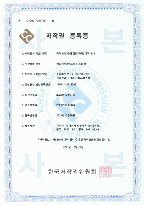 [한국/저작권] 독거 노인 응급 상황(화재) 대피 안내 페이지 정보 작성자 WeDu 댓글 0건 조회 6,986회 작성일 21-12-31 12:41 본문 2021-10-21 저작권 C-2021-041725 영상저작물>교육용 동영상 List Previous[한국/저작권] 장보기 인지훈련 게임 21.12.31 Next[한국/저작권] OLL KIDS/MATH 21.12.31